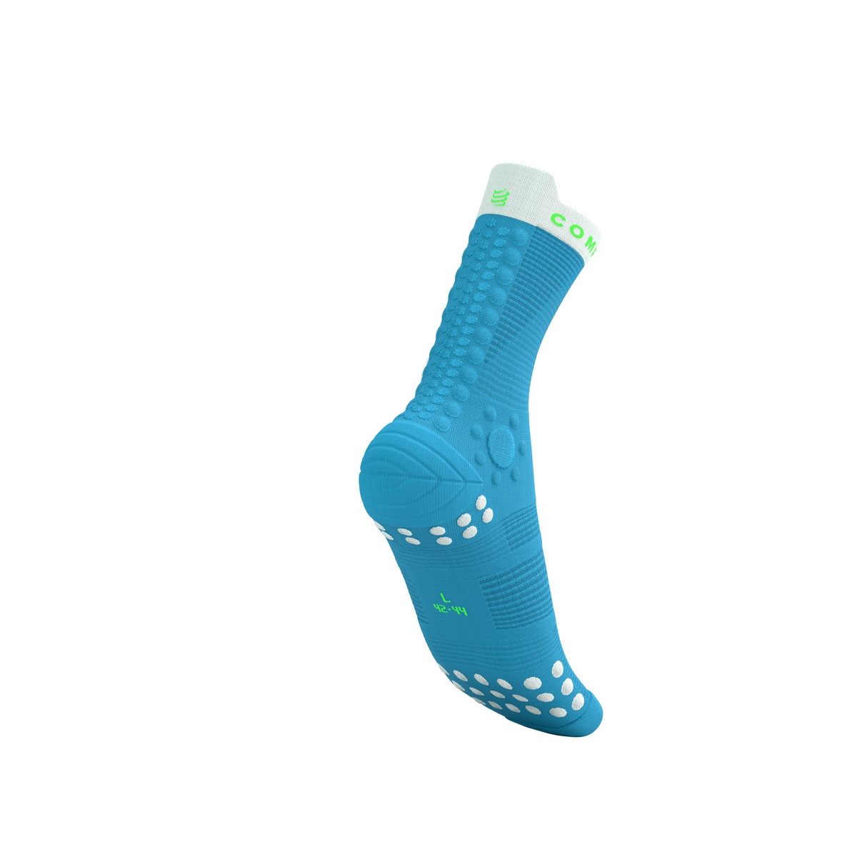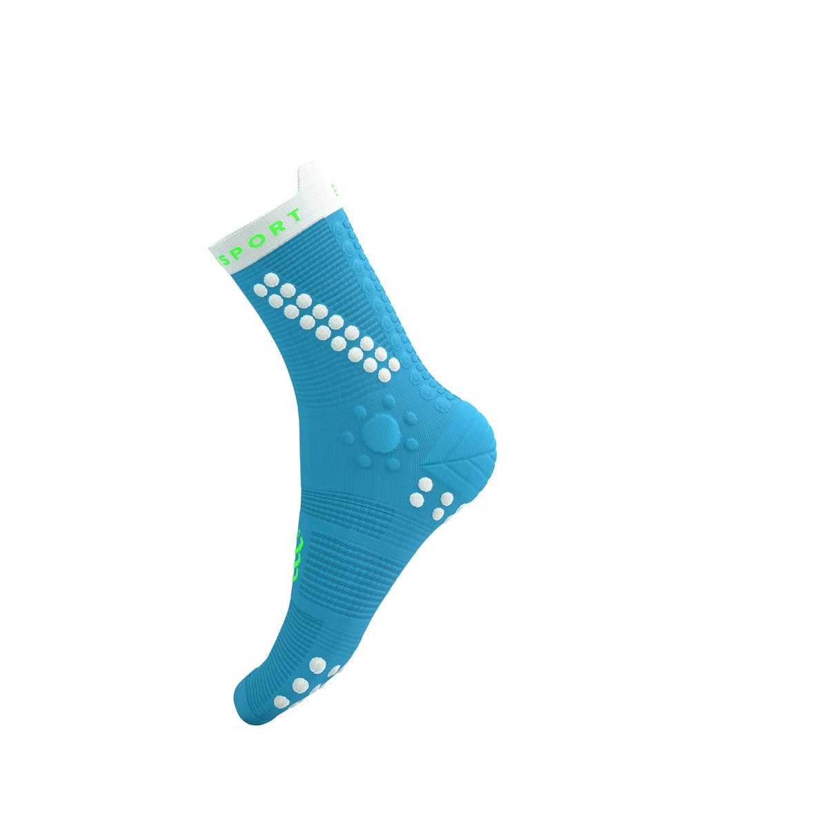 - 3D.DOTS’i (3D tehnoloogiliste punktide) ja Flat.Dots’i kombinatsioon soki tagaosas – pehmendav efekt, mis kaitseb Achilleuse kõõlust hõõrdumise ja surve eest. Pehmendavad punktid (3D.DOTS) on tihedamad ja paksemad, kui Compressport Run V4.0 jooksusokkidel.
